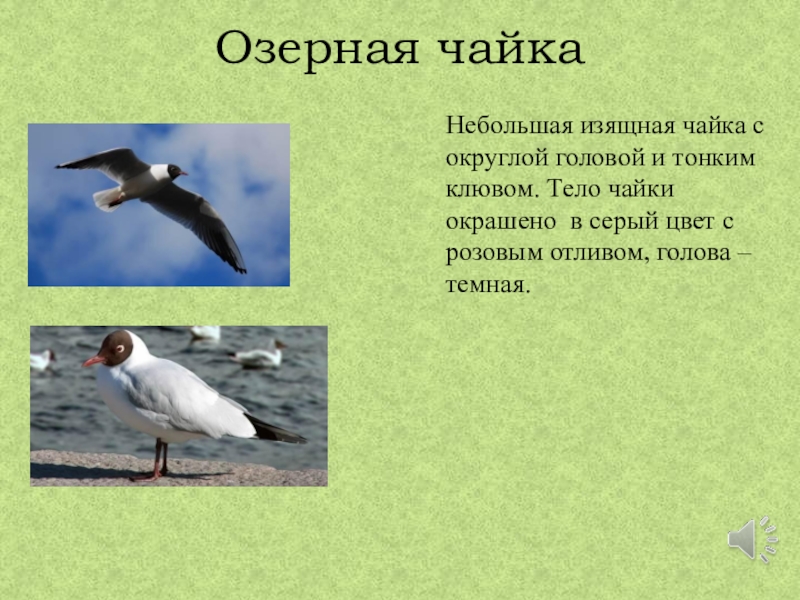 Озерная чайкаНебольшая изящная чайка с округлой головой и тонким клювом. Тело чайки окрашено в серый цвет с