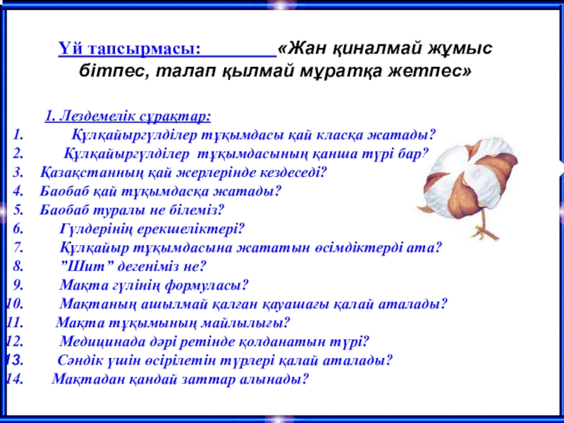 Үй тапсырмасы: «Жан қиналмай жұмыс бітпес, талап қылмай мұратқа жетпес»