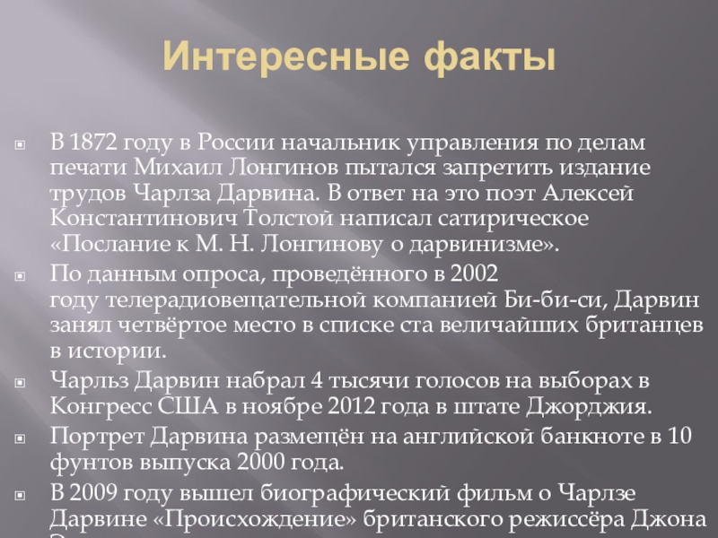 Интересные фактыВ 1872 году в России начальник управления по делам печати Михаил Лонгинов пытался запретить издание трудов Чарлза Дарвина. В ответ