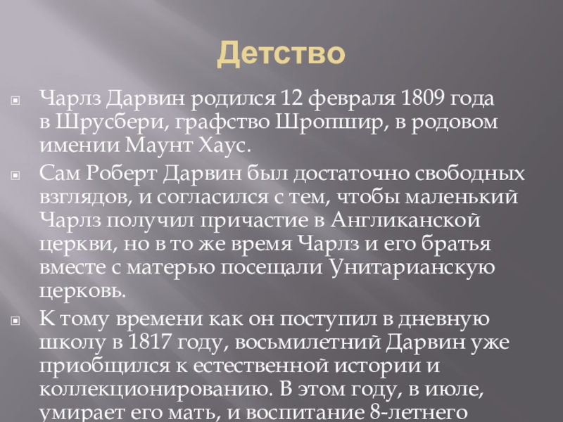 ДетствоЧарлз Дарвин родился 12 февраля 1809 года в Шрусбери, графство Шропшир, в родовом имении Маунт Хаус.Сам Роберт Дарвин был