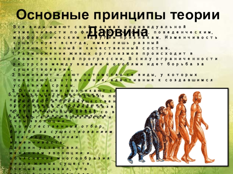 Основные принципы теории ДарвинаВсе виды имеют свой размах индивидуальной изменчивости по физиологическим, поведенческим, морфологическим и другим признакам.