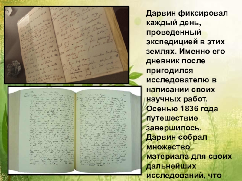 Слайд 13Дарвин фиксировал каждый день, проведенный экспедицией в этих землях. Именно его