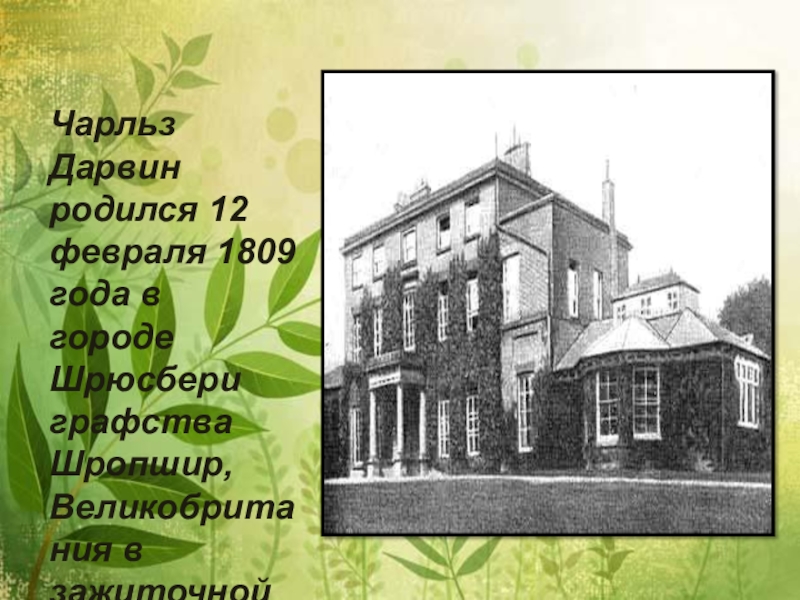 Чарльз Дарвин родился 12 февраля 1809 года в городе Шрюсбери графства Шропшир, Великобритания в зажиточной английской семье..