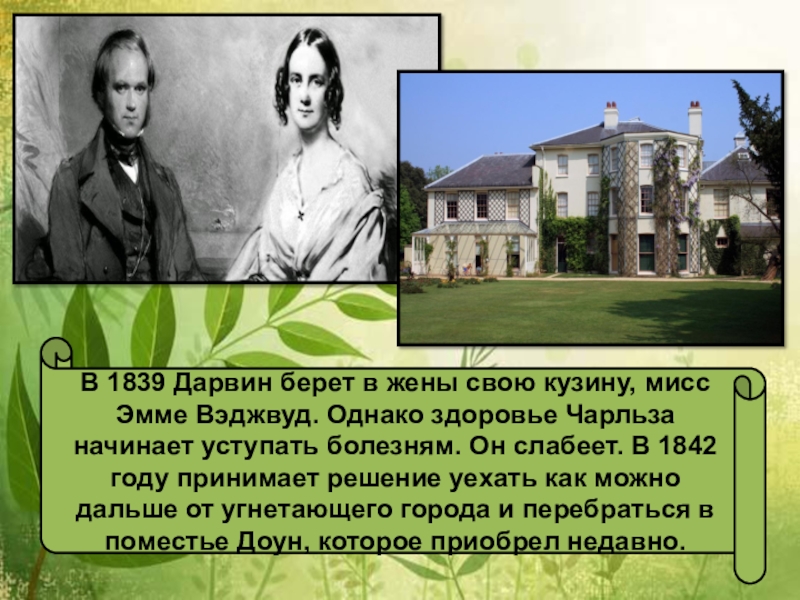 В 1839 Дарвин берет в жены свою кузину, мисс Эмме Вэджвуд. Однако здоровье Чарльза начинает уступать болезням.