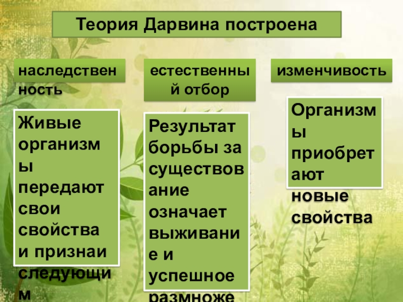 Теория Дарвина построенанаследственностьизменчивостьестественный отборОрганизмы приобретают новые свойстваРезультат борьбы за существование означает выживание и успешное размножение организмовЖивые организмы