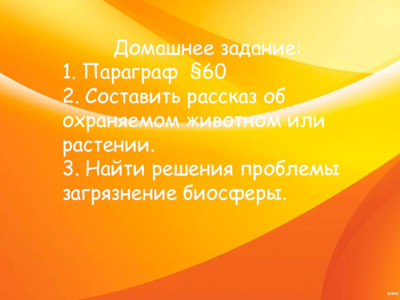 Домашнее задание:1. Параграф §60 2. Составить рассказ об охраняемом животном или растении.3. Найти решения проблемы загрязнение биосферы.