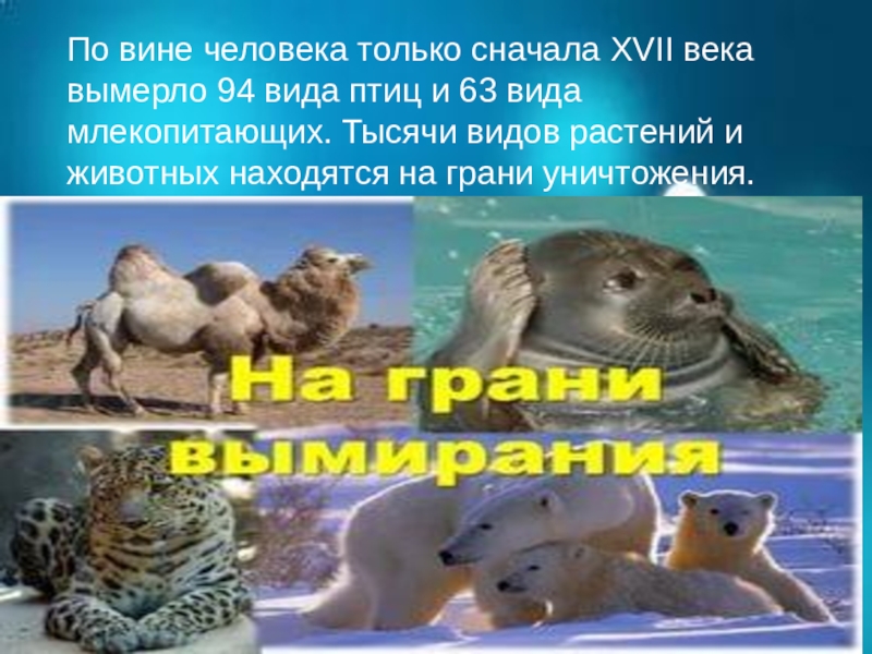 По вине человека только сначала XVII века вымерло 94 вида птиц и 63 вида млекопитающих. Тысячи видов