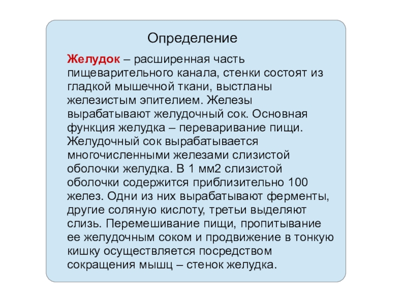 ткани, выстланы железистым эпителием. Железы вырабатывают желудочный сок. Основная функция желудка – переваривание пищи. Желудочный сок вырабатывается многочисленными железами слизистой оболочки желудка. В 1 мм2 слизистой оболочки содержится приблизительно 100 желез. Одни из них вырабатывают ферменты, другие соляную кислоту, третьи выделяют слизь. Перемешивание пищи, пропитывание ее желудочным соком и продвижение в тонкую кишку осуществляется посредством сокращения мышц – стенок желудка.