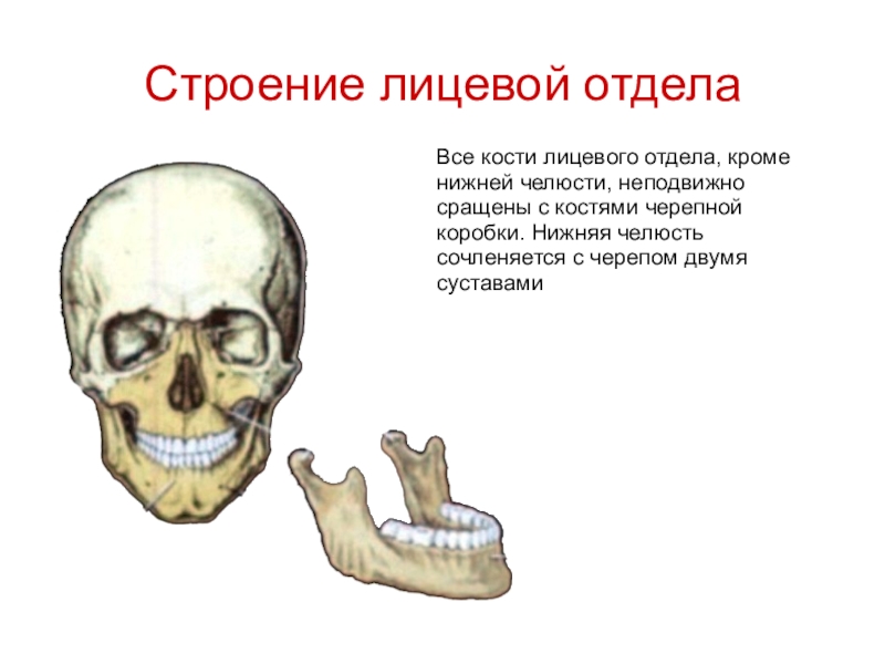 Все кости лицевого отдела, кроме нижней челюсти, неподвижно