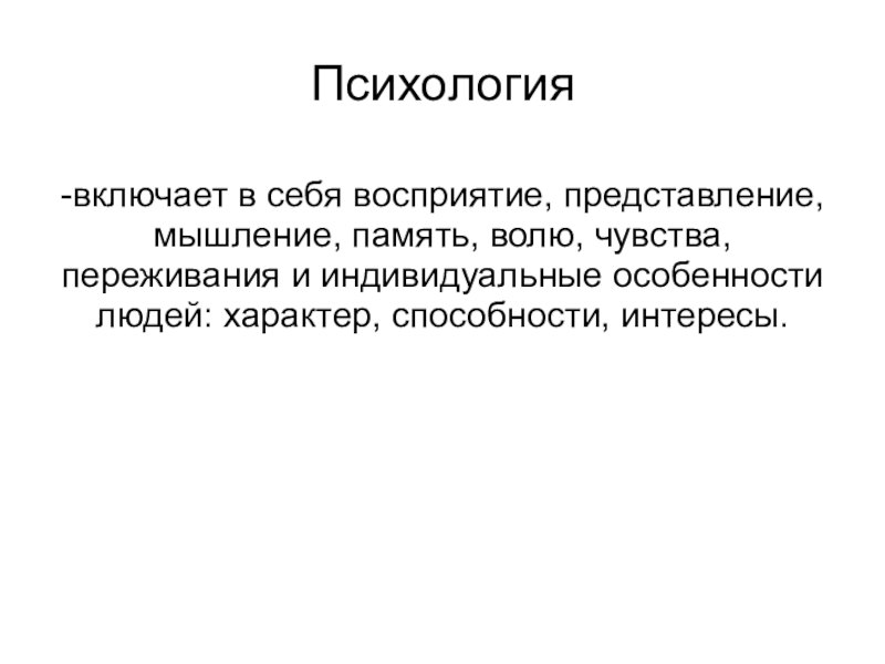 -включает в себя восприятие, представление, мышление, память, волю, чувства, переживания и