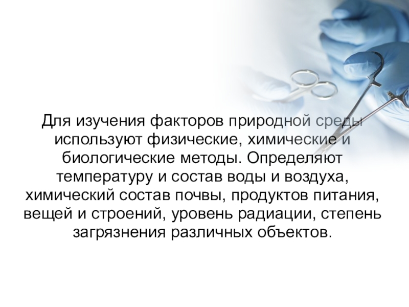 Слайд 47Для изучения факторов природной среды используют физические, химические и биологические методы.
