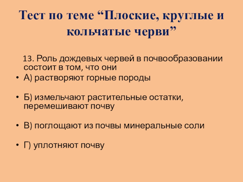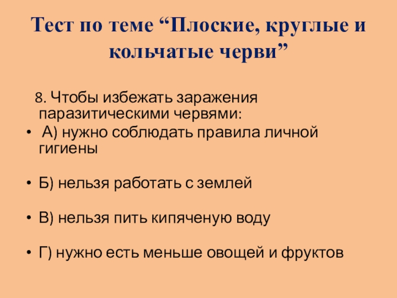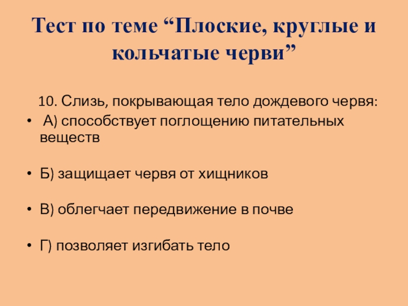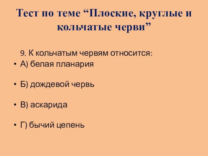 Слайд 21Тест по теме “Плоские, круглые и кольчатые черви”
