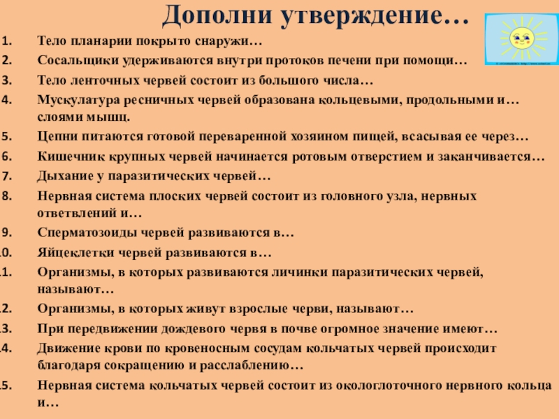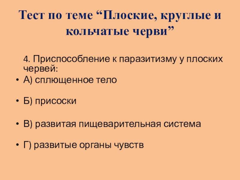 Слайд 24Тест по теме “Плоские, круглые и кольчатые черви”