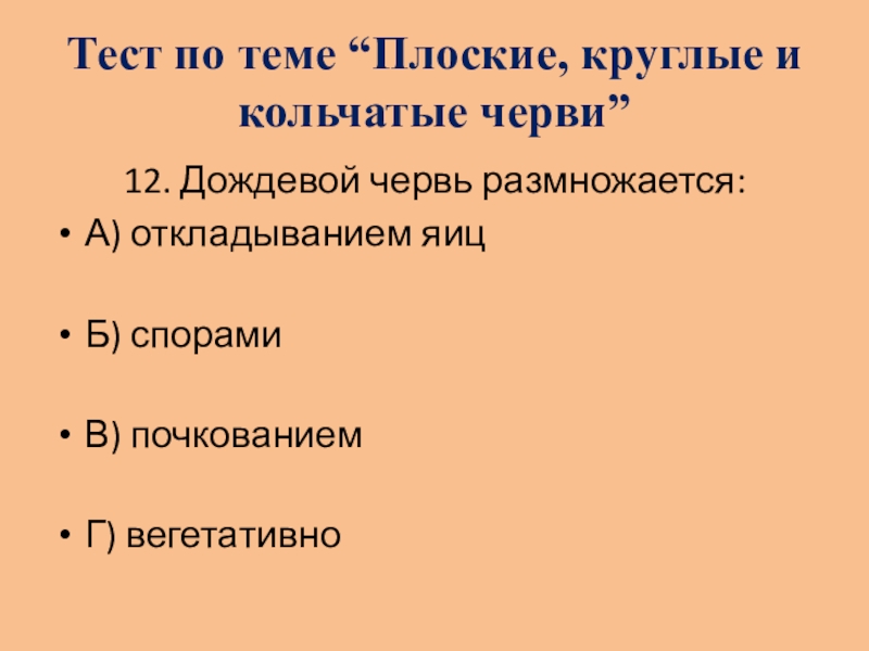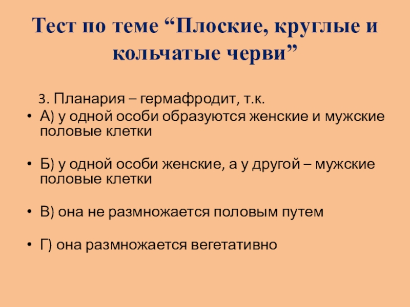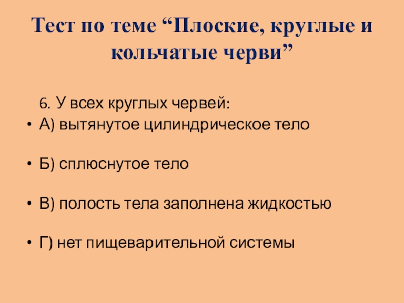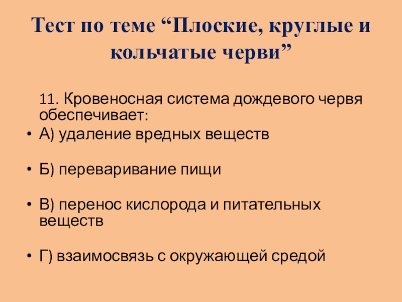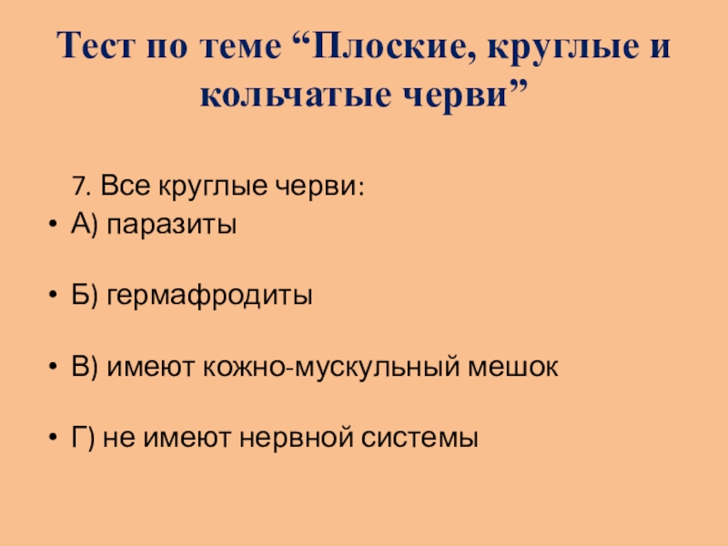 Слайд 25Тест по теме “Плоские, круглые и кольчатые черви”