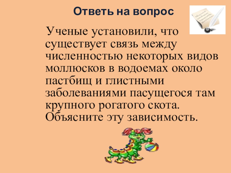 некоторых видов моллюсков в водоемах около пастбищ и глистными заболеваниями пасущегося там крупного рогатого скота. Объясните эту зависимость.