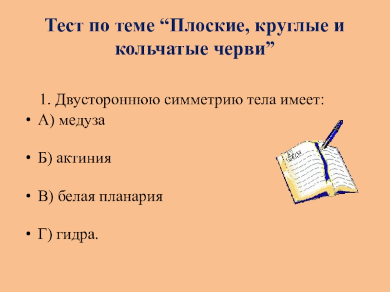 Слайд 26Тест по теме “Плоские, круглые и кольчатые черви”