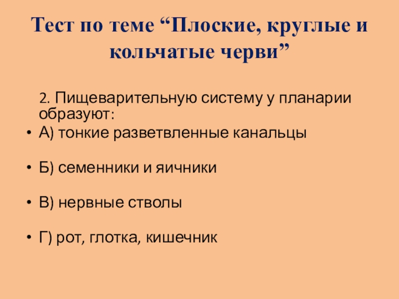 Слайд 20Тест по теме “Плоские, круглые и кольчатые черви”