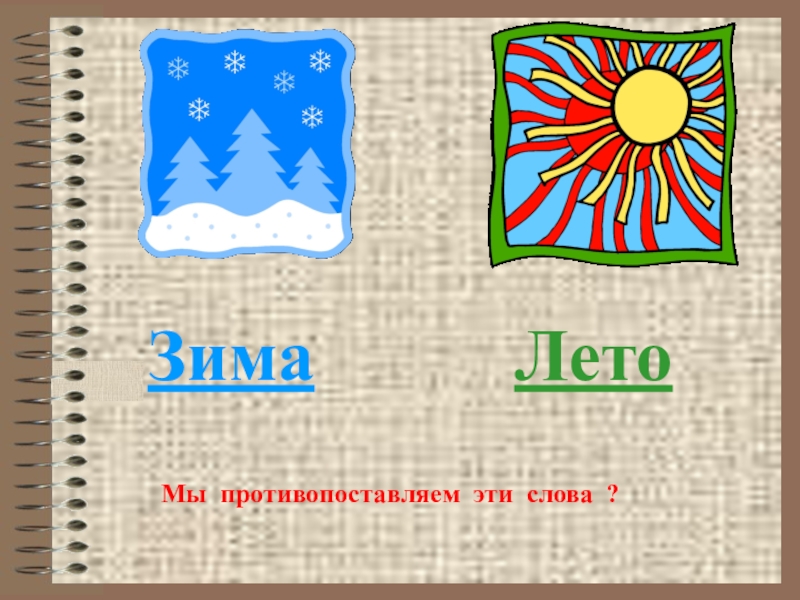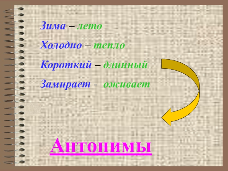 Зима – летоХолодно – теплоКороткий – длинныйЗамирает - оживает Антонимы