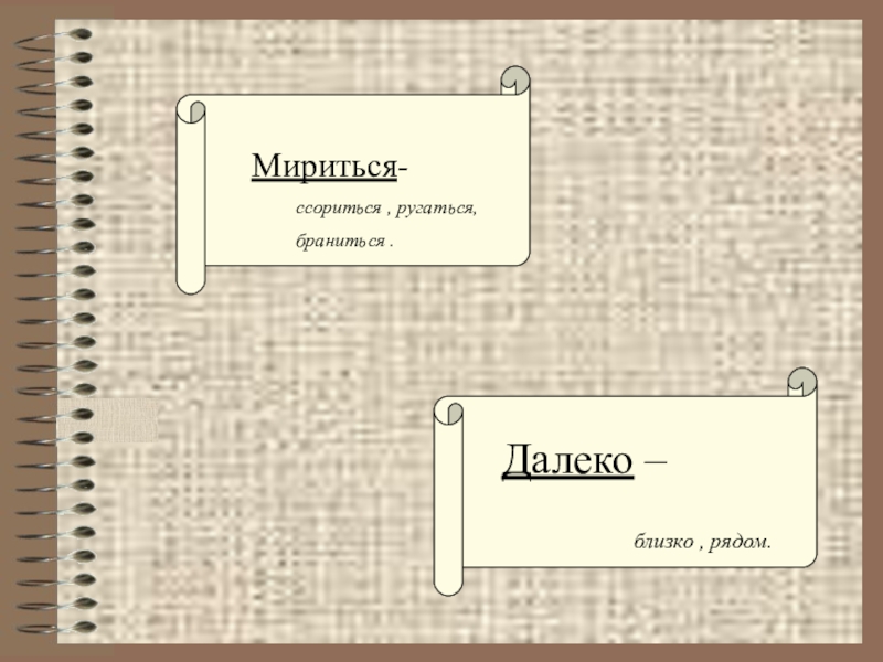 Мириться-     ссориться , ругаться,     браниться .Далеко –
