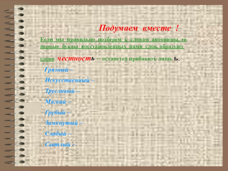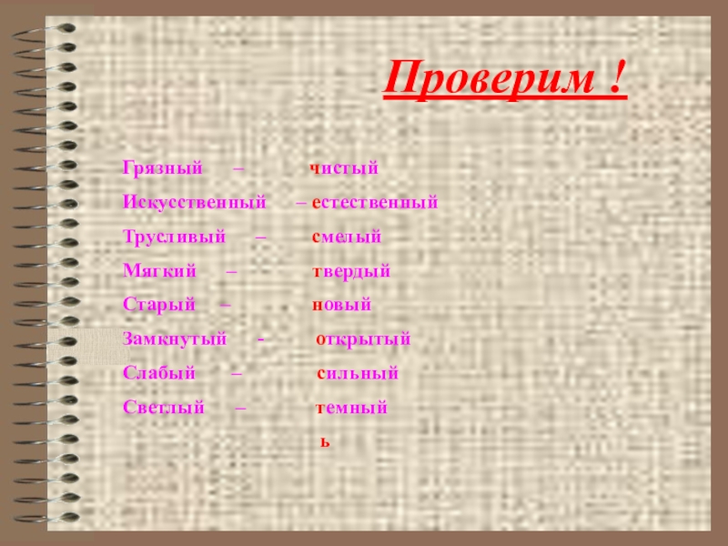 Проверим !Грязный   –       чистыйИскусственный   – естественныйТрусливый