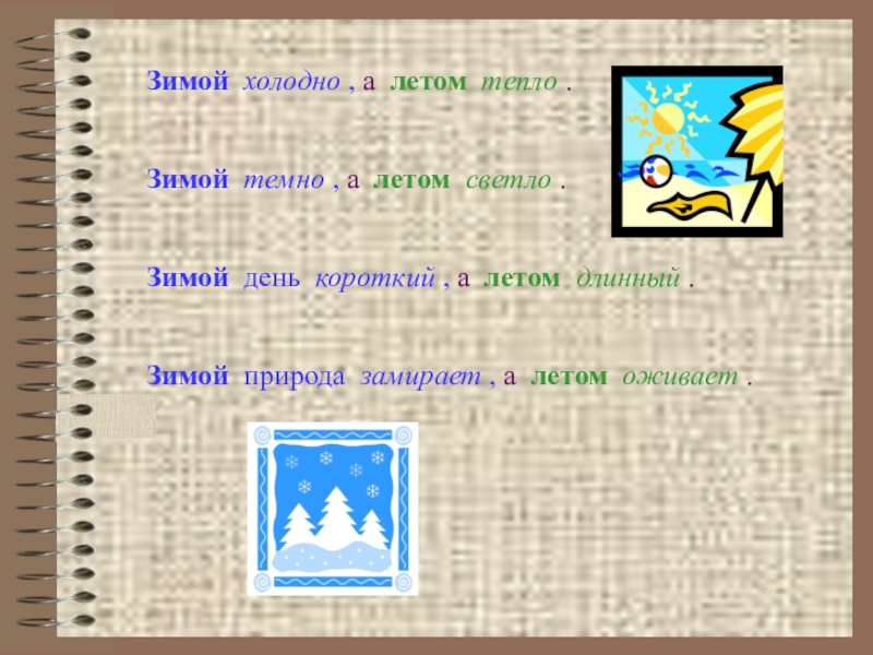 Зимой холодно , а летом тепло .Зимой темно , а летом светло .Зимой день короткий , а