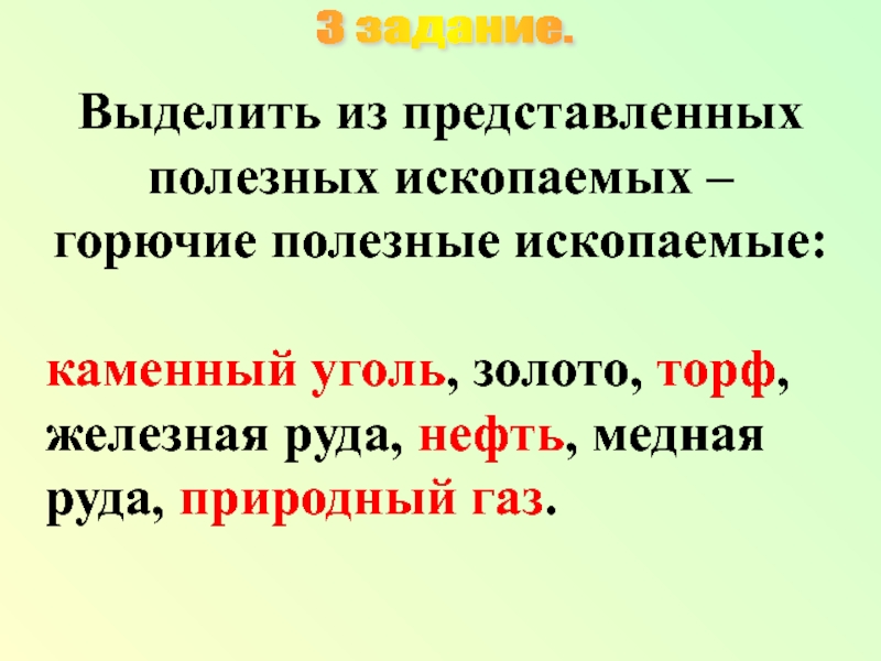Выделить из представленных полезных ископаемых – горючие полезные ископаемые:
