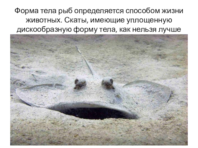 Слайд 7Форма тела рыб определяется способом жизни животных. Скаты, имеющие уплощенную дискообразную