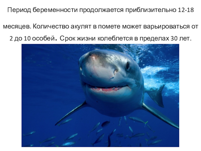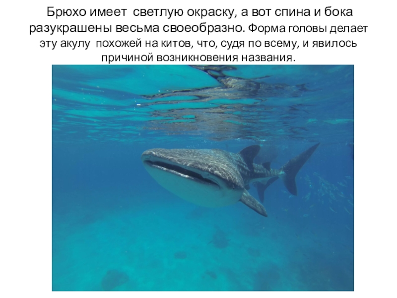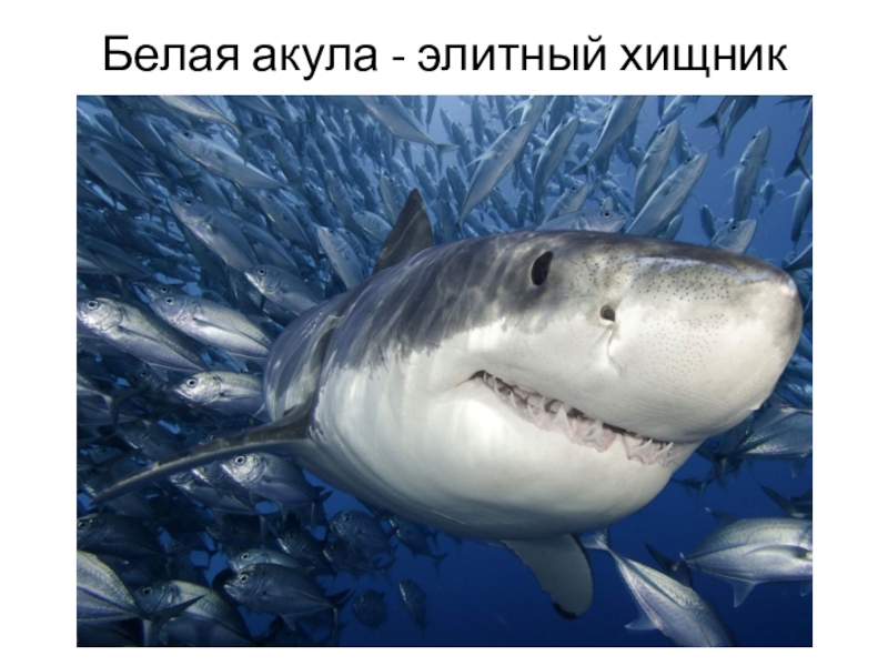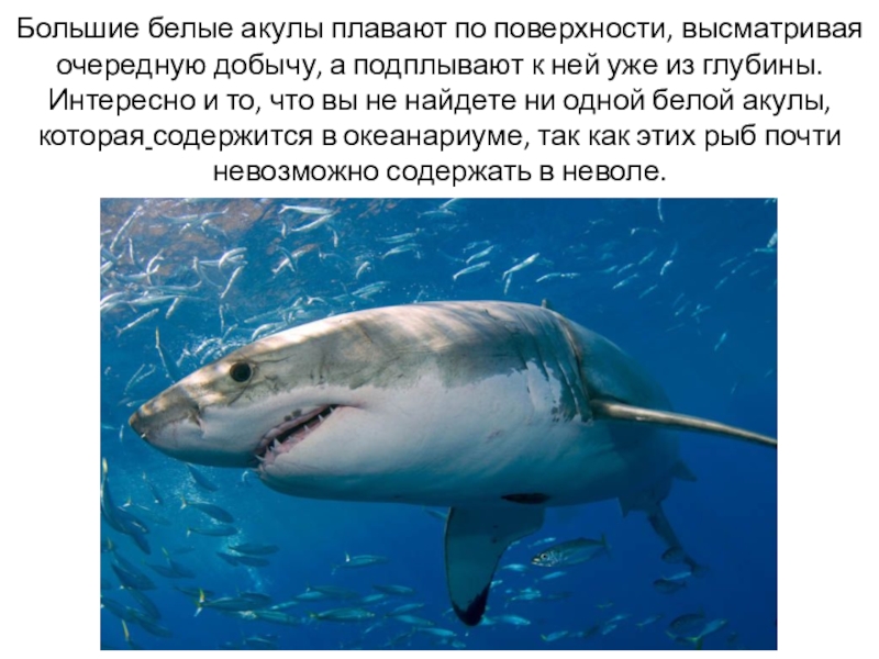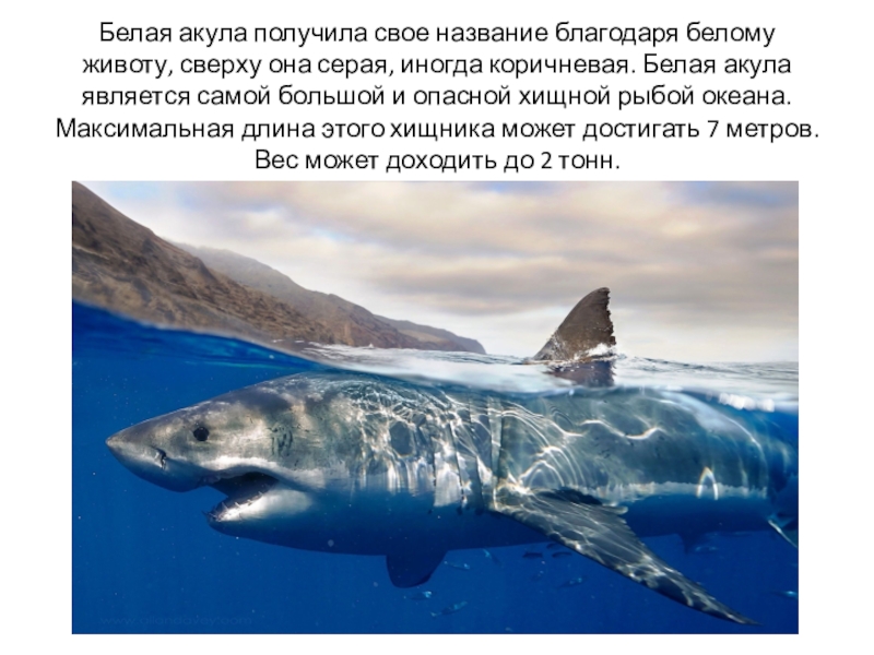 Слайд 19Белая акула получила свое название благодаря белому животу, сверху она серая,