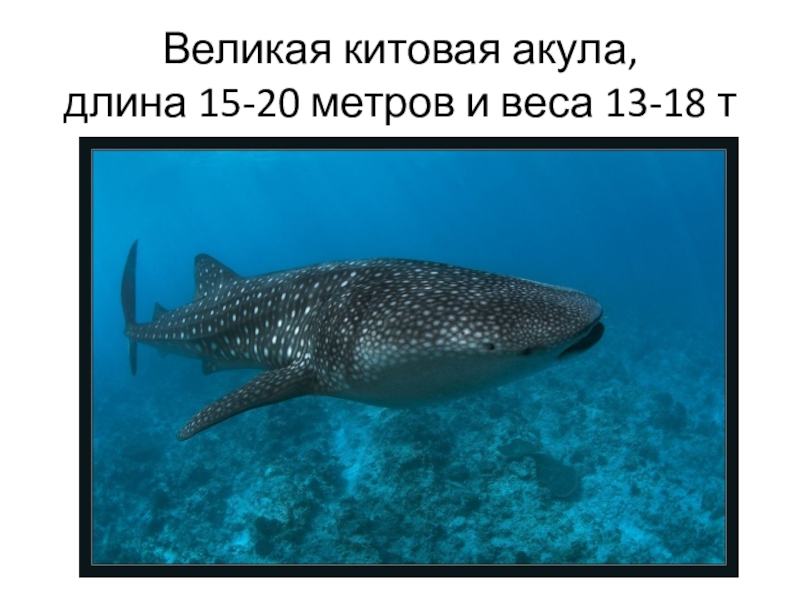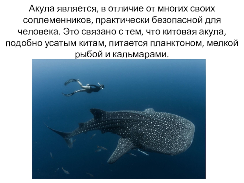 человека. Это связано с тем, что китовая акула, подобно усатым китам, питается планктоном, мелкой рыбой и кальмарами.