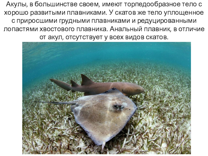 У скатов же тело уплощенное с приросшими грудными плавниками и редуцированными лопастями хвостового плавника. Анальный плавник, в отличие от акул, отсутствует у всех видов скатов.