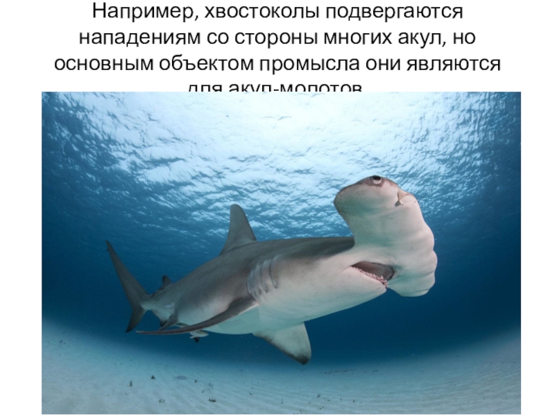 Слайд 15Например, хвостоколы подвергаются нападениям со стороны многих акул, но основным объектом