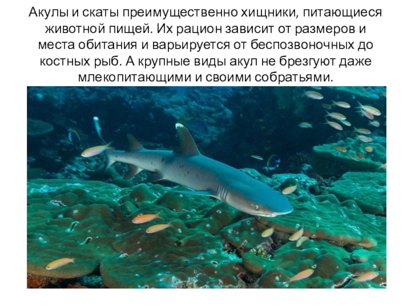 Слайд 10Акулы и скаты преимущественно хищники, питающиеся животной пищей. Их рацион зависит