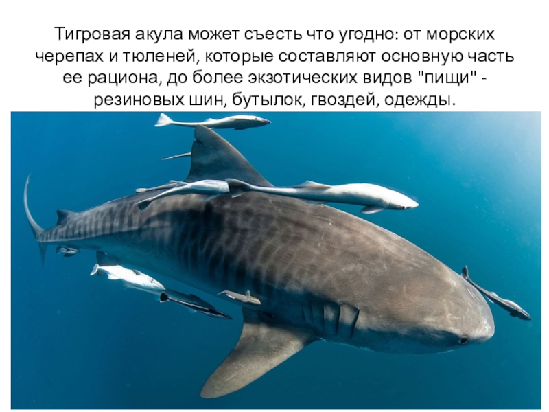 Слайд 27Тигровая акула может съесть что угодно: от морских черепах и тюленей, которые