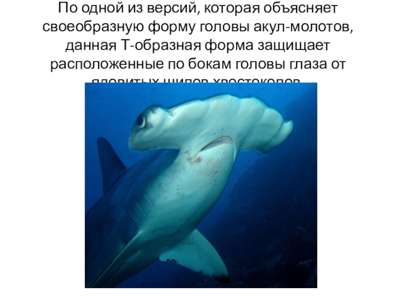 Слайд 16По одной из версий, которая объясняет своеобразную форму головы акул-молотов, данная