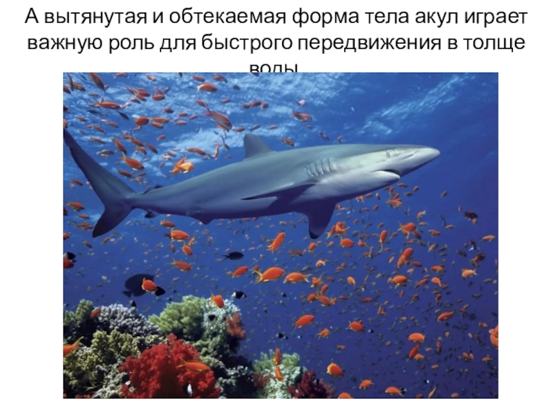 Слайд 8А вытянутая и обтекаемая форма тела акул играет важную роль для