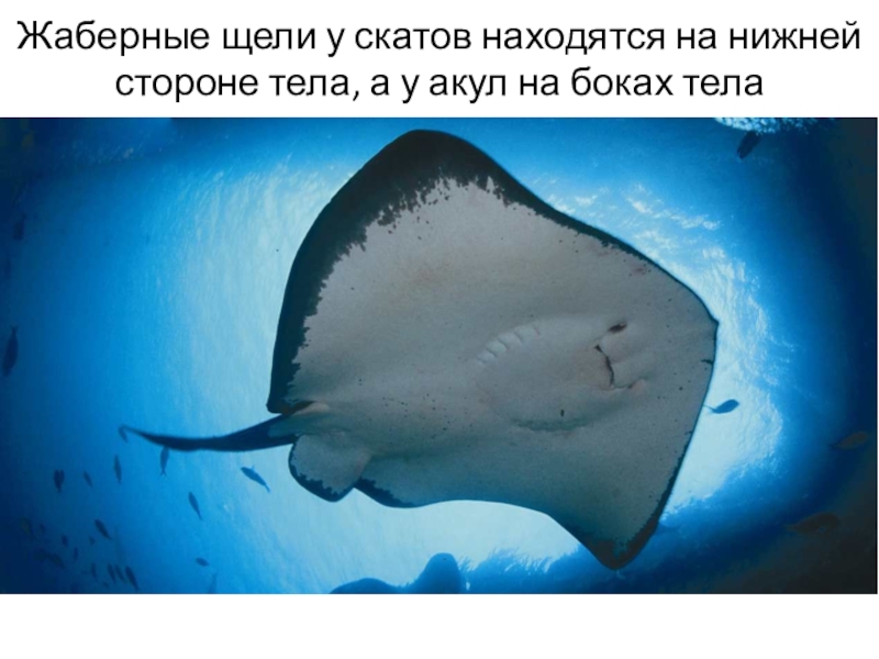 Слайд 4Жаберные щели у скатов находятся на нижней стороне тела, а у