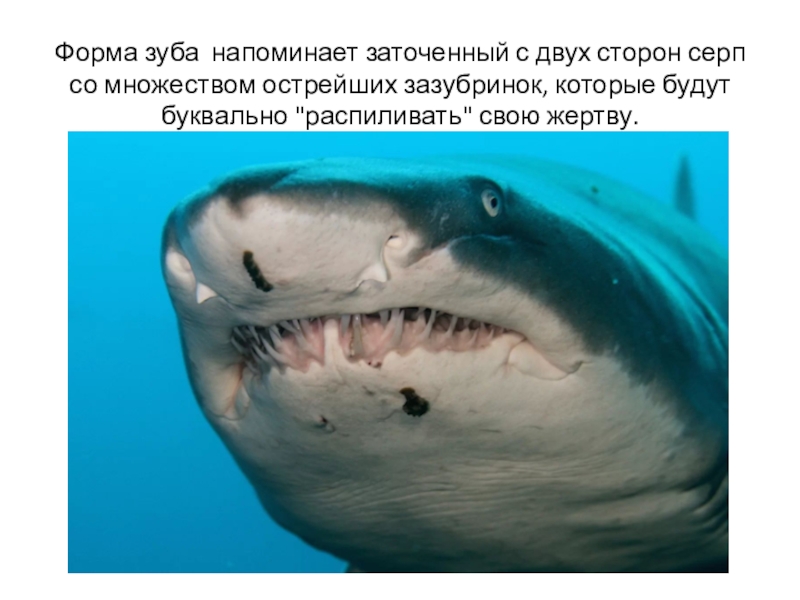 Слайд 29Форма зуба напоминает заточенный с двух сторон серп со множеством острейших