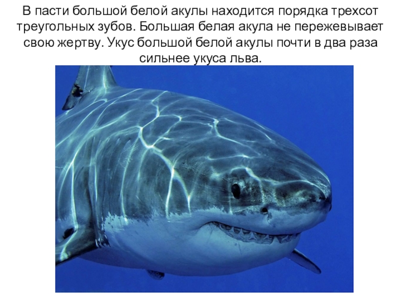 акула не пережевывает свою жертву. Укус большой белой акулы почти в два раза сильнее укуса льва.