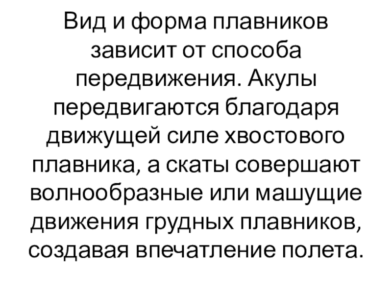 Слайд 9Вид и форма плавников зависит от способа передвижения. Акулы передвигаются благодаря
