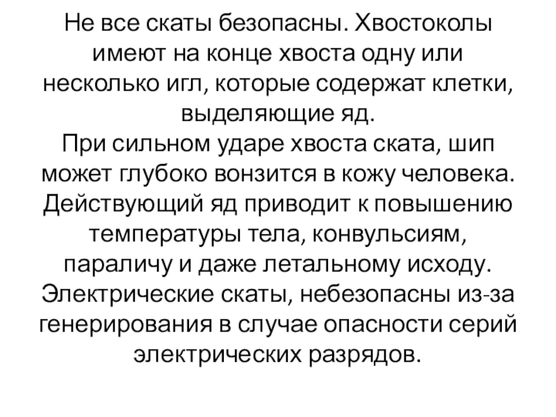 При сильном ударе хвоста ската, шип может глубоко вонзится в кожу человека. Действующий яд приводит к повышению температуры тела, конвульсиям, параличу и даже летальному исходу. Электрические скаты, небезопасны из-за генерирования в случае опасности серий электрических разрядов.
