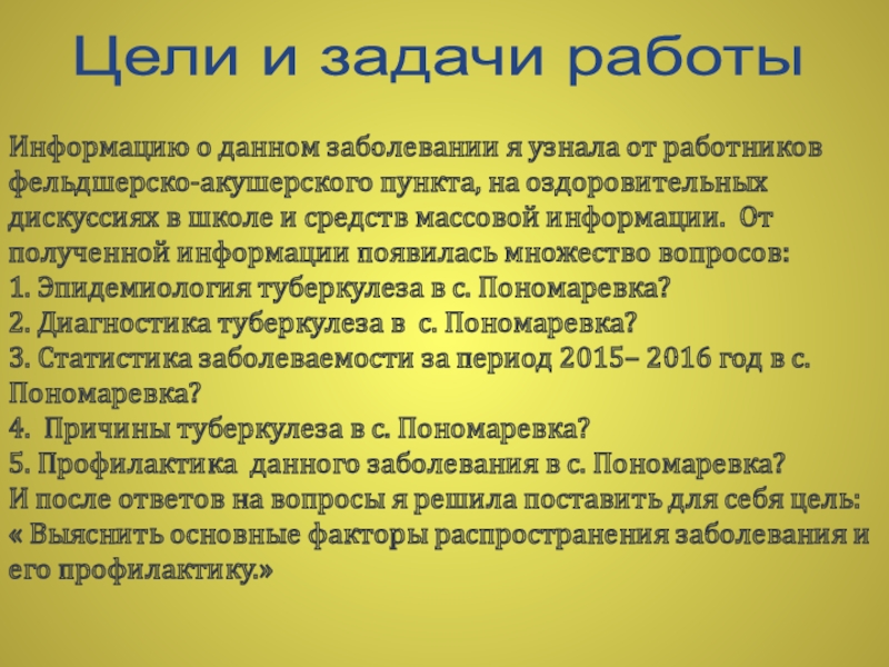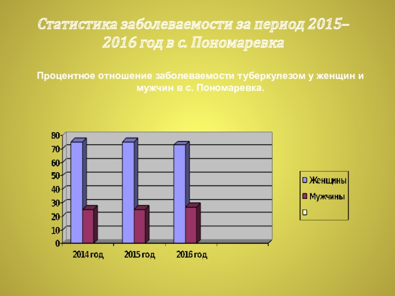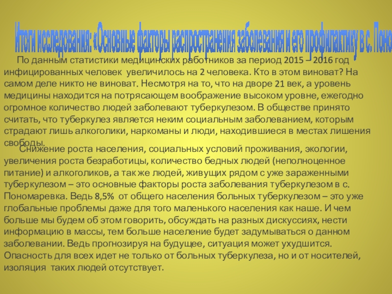Снижение роста населения, социальных условий проживания, экологии, увеличения роста безработицы, количество бедных людей (неполноценное питание) и алкоголиков, а так же людей, живущих рядом с уже зараженными туберкулезом – это основные факторы роста заболевания туберкулезом в с. Пономаревка. Ведь 8,5% от общего населения больных туберкулезом – это уже глобальные проблемы даже для того маленького населения как наше. И чем больше мы будем об этом говорить, обсуждать на разных дискуссиях, нести информацию в массы, тем больше население будет задумываться о данном заболевании. Ведь прогнозируя на будущее, ситуация может ухудшится. Опасность для всех идет не только от больных туберкулеза, но и от носителей, изоляция таких людей отсутствует.