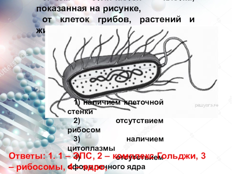 Ответы: 1. 1 – ЭПС, 2 – комплекс Гольджи, 3 – рибосомы, 4 – ядро,