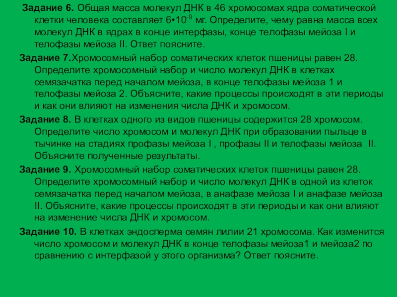 Слайд 13 Задание 6. Общая масса молекул ДНК в 46 хромосомах ядра