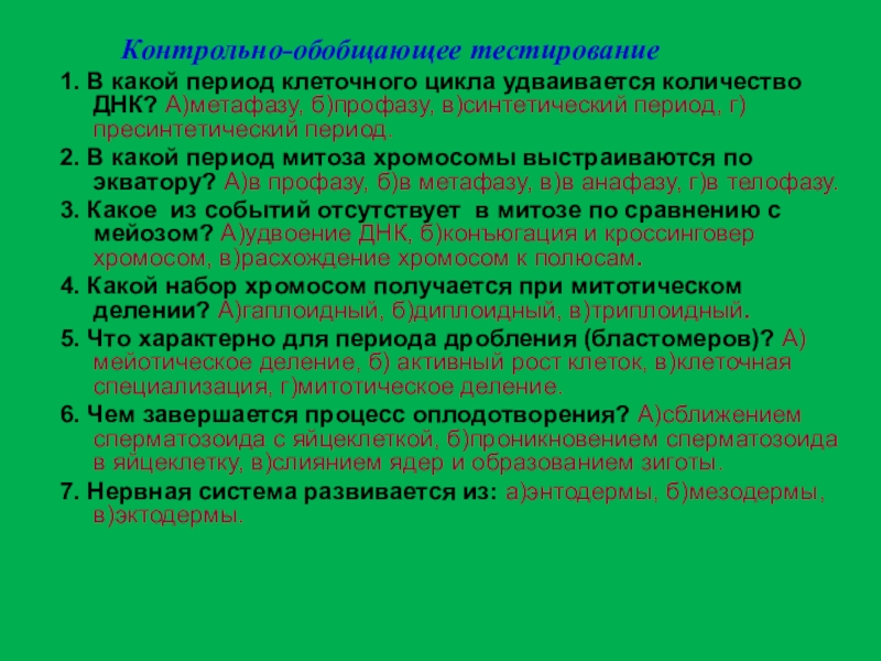 5. Что характерно для периода дробления (бластомеров)? А)мейотическое деление, б) активный рост клеток, в)клеточная специализация, г)митотическое деление.