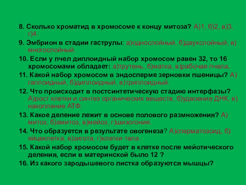 8. Сколько хроматид в хромосоме к концу митоза? А)1, б)2, в)3,