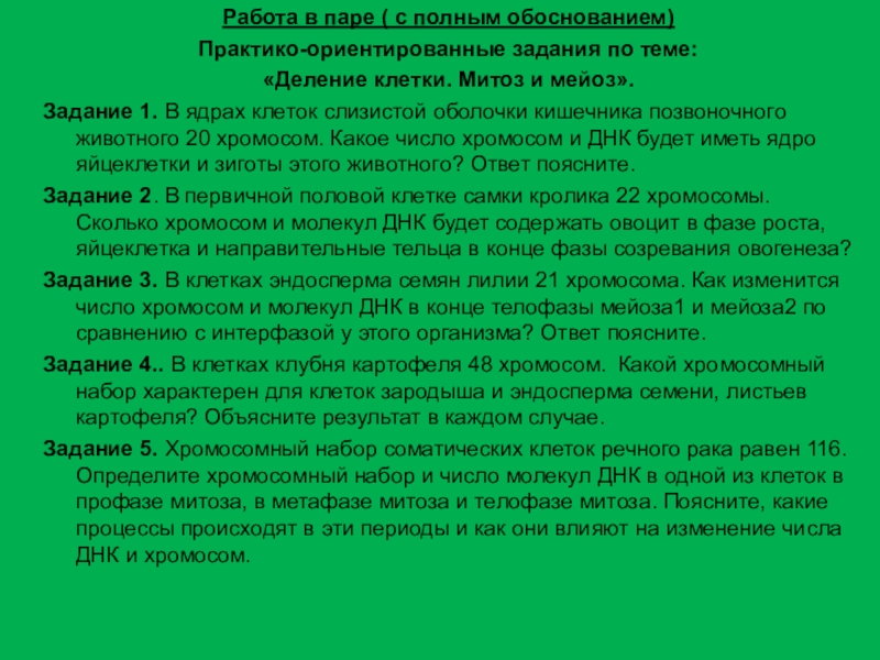 Задание 1. В ядрах клеток слизистой оболочки кишечника позвоночного животного 20 хромосом. Какое число хромосом и ДНК будет иметь ядро яйцеклетки и зиготы этого животного? Ответ поясните.