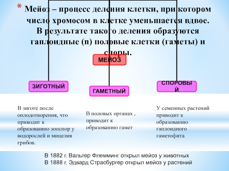 В 1882 г. Вальтер Флемминг открыл мейоз у животных