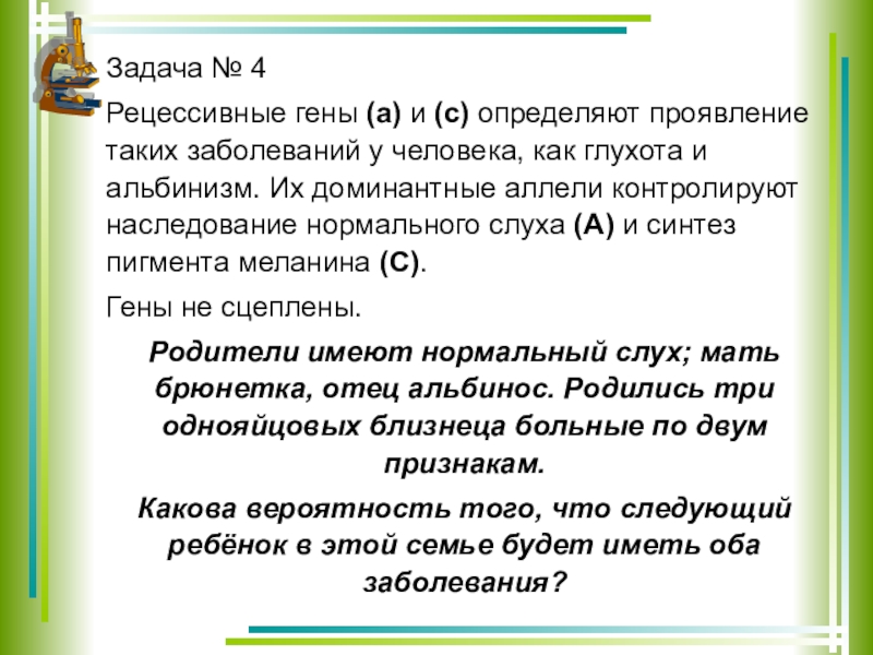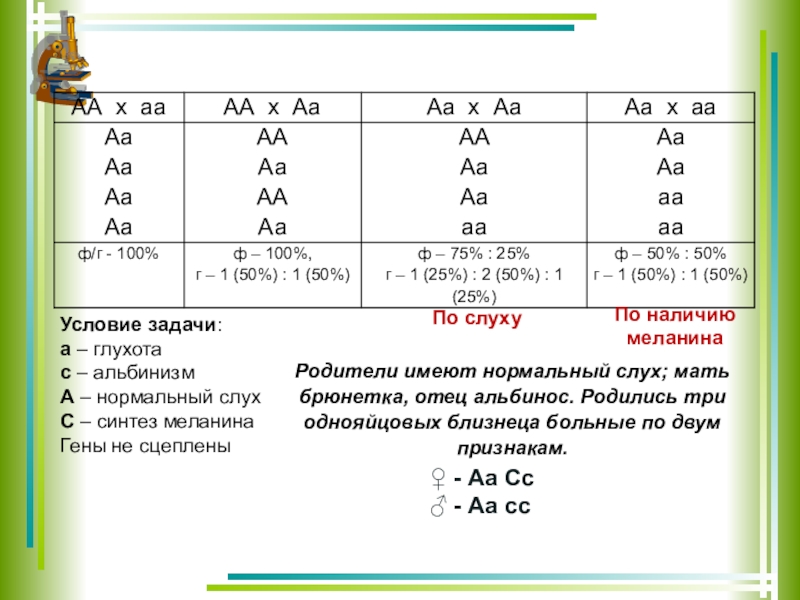 Родители имеют нормальный слух; мать брюнетка, отец альбинос. Родились три однояйцовых близнеца больные по двум признакам.