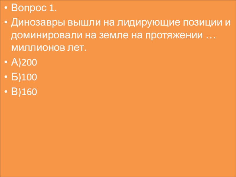 Вопрос 1.Динозавры вышли на лидирующие позиции и доминировали на земле на протяжении … миллионов лет. А)200Б)100В)160