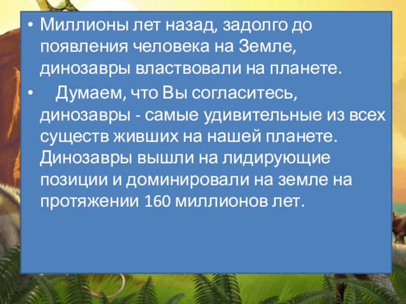 Слайд 2Миллионы лет назад, задолго до появления человека на Земле, динозавры властвовали